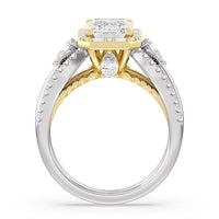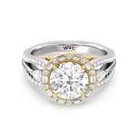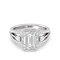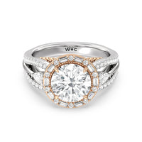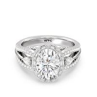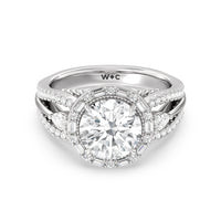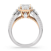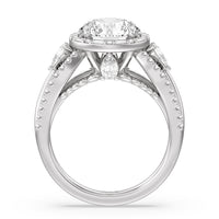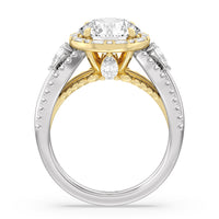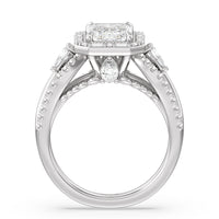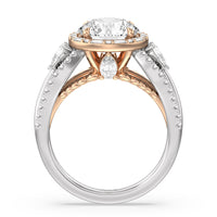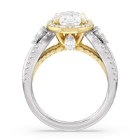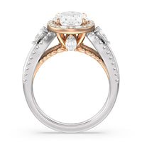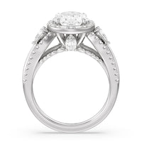 This engagement ring showcases the perfect balance of charm and glamour. It features a classic cathedral shank with pear-shaped diamond side stones nestled in between diamond pavé edges. The glistening arches lead to the center gem secured by four prongs and surrounded by a diamond halo. Refined detailing beneath the centerpiece brings a discreet charm to the ring.