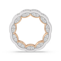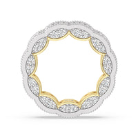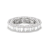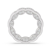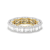 It is impossible not to be hypnotized by this ring. This piece exudes exquisite beauty on every side. It features a scalloped profile with milgrain-detailed edges complemented by a wavy loop of emerald-cut diamonds. The inner shank features a more defined scalloped detail with two round diamonds punctuating each curve.