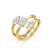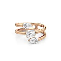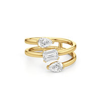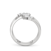 Emerald-cut and round diamonds in a modern bypass setting. Balanced proportions, high shine, effortless contrast.