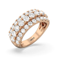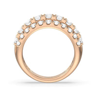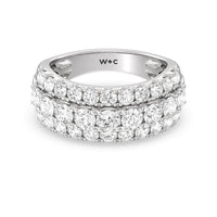 A striking sparkler for someone who prefers her ring to be bright and radiant without being ostentatious. This anniversary ring features a tapering band with a wide top to accommodate three rows of diamonds. The elevated central row of white and bright gemstones features slightly larger diamonds for added visual interest.