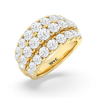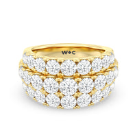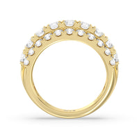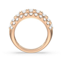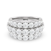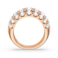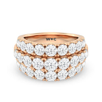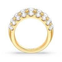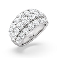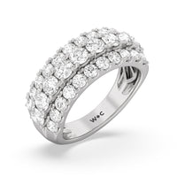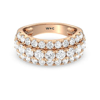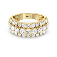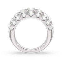 A striking sparkler for someone who prefers her ring to be bright and radiant without being ostentatious. This anniversary ring features a tapering band with a wide top to accommodate three rows of diamonds. The elevated central row of white and bright gemstones features slightly larger diamonds for added visual interest.