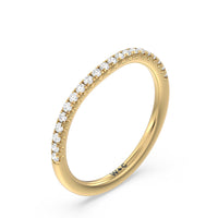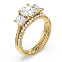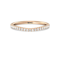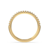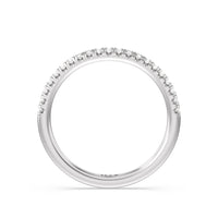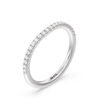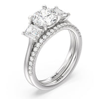 This curved diamond set wedding band is perfectly contoured to complement our three stone hidden accent bridge classic diamond engagement ring for a simple and sophisticated look.