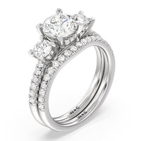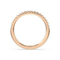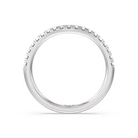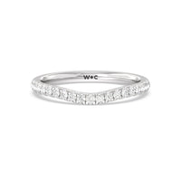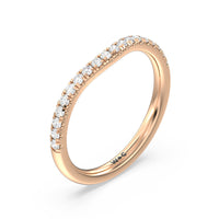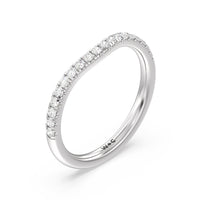 This curved diamond set wedding band is perfectly contoured to complement our three stone hidden halo cathedral engagement ring for a simple and sophisticated look.