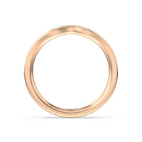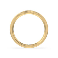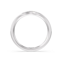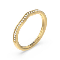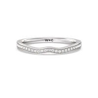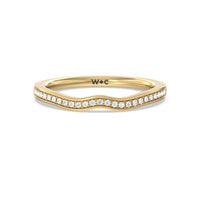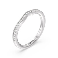 This curved diamond set wedding band is perfectly contoured to complement our three-stone pave diamond engagement ring for a simple and sophisticated look.
