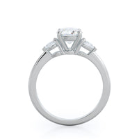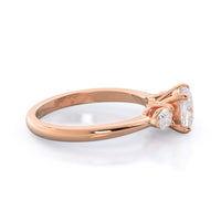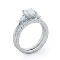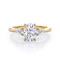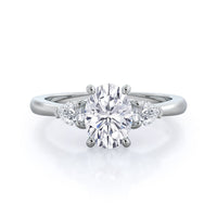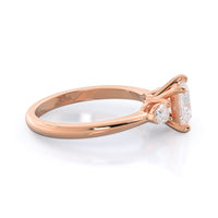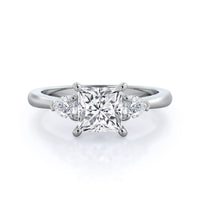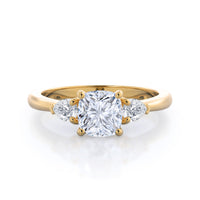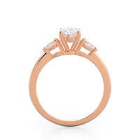 Two beautiful pear shaped diamonds offer an elegant variation to a classic three stone diamond ring