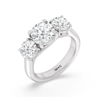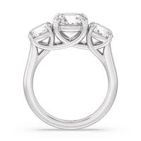 This softly rounded trellis setting features interwoven prongs sweeping upwards to embrace the trio of round brilliant-cut diamonds