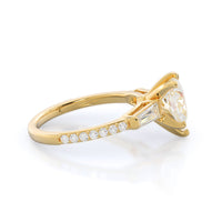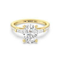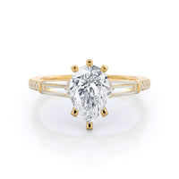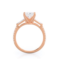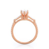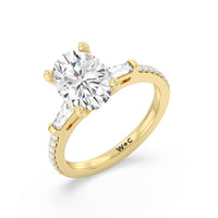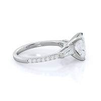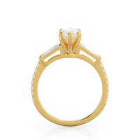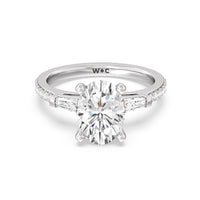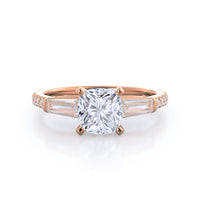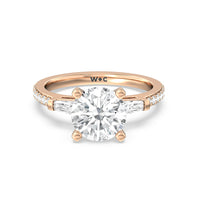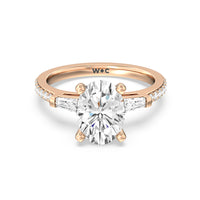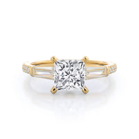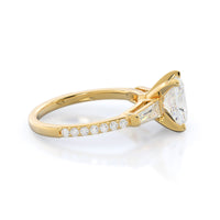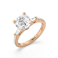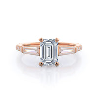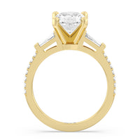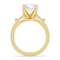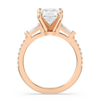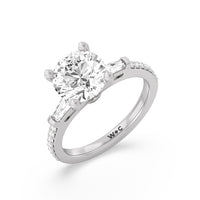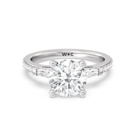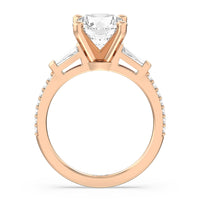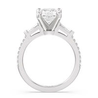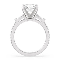 Diamonds feature a three-stone style with classic tapered baguettes and round paved stones