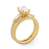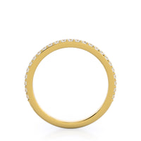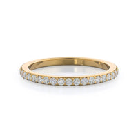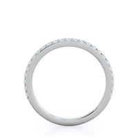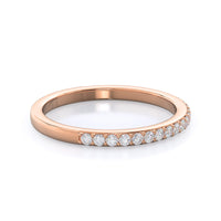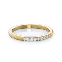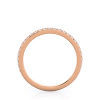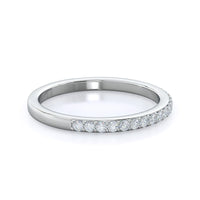 Traditional pave and a slightly domed band make this into a matching wedding band for your Three Stone Tapered Baguette Diamond Engagement Ring. Copying the outer parts of the engagement ring's shank, this pave wedding band helps highlight those three center diamonds in your setting.