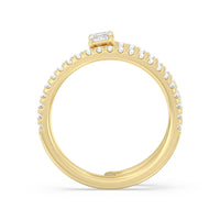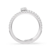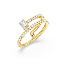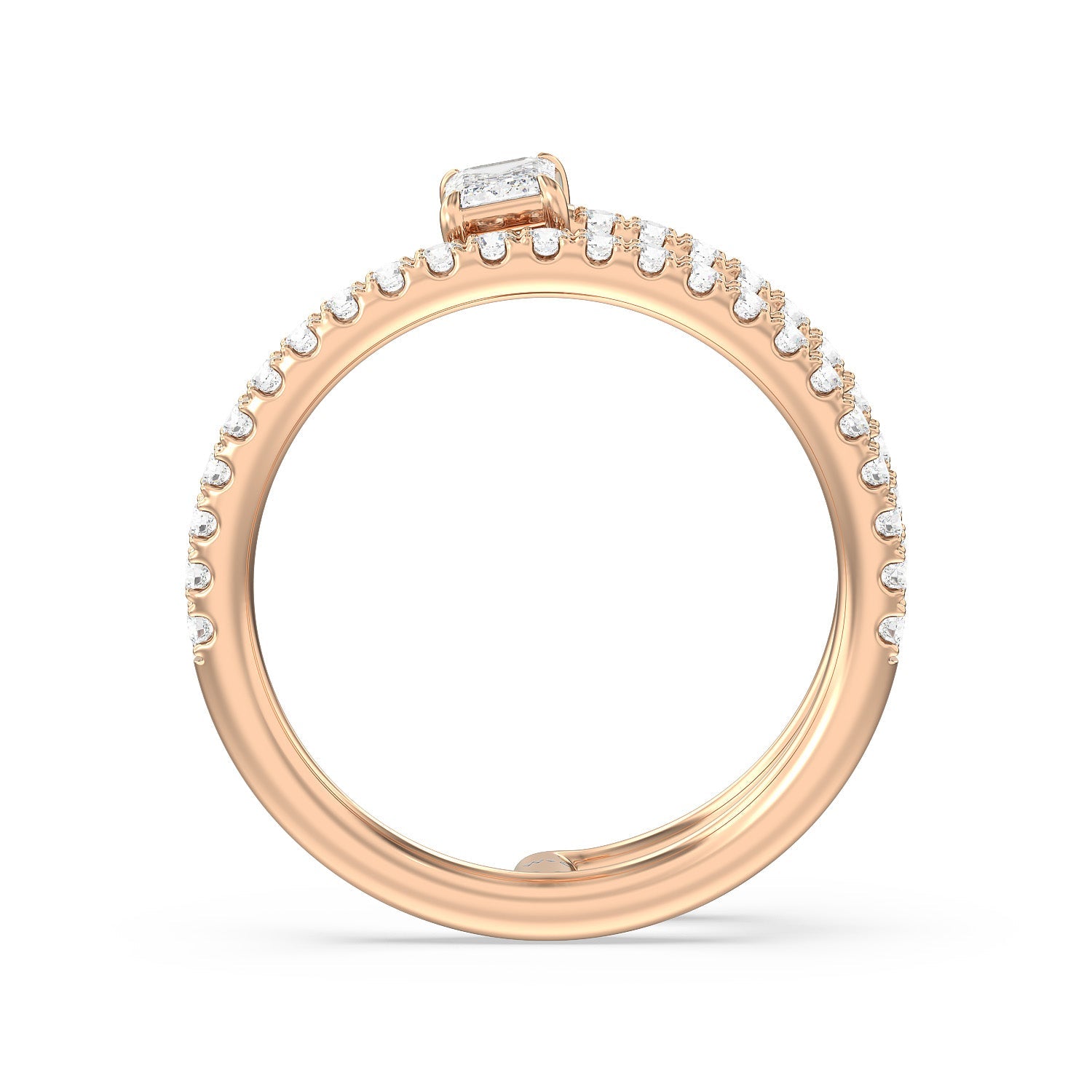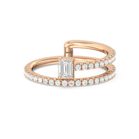 Unique and chic, this diamond ring impresses with its uncluttered look and unconventional style. It features a stacked-like and coil-like design with its slim band and half-circle offshoot. The half-circle band that stems from the pave-set full-circle band bears an emerald-cut diamond tip for added style.