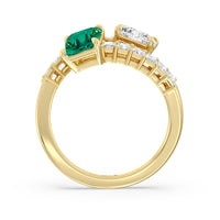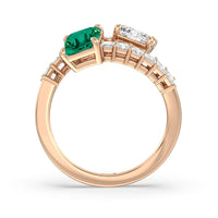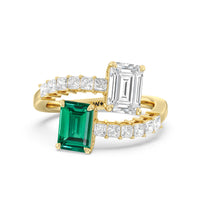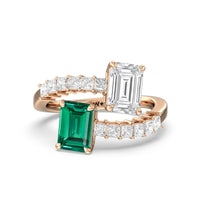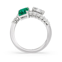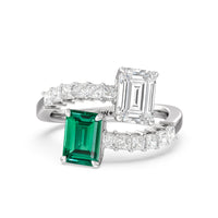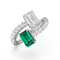 An alternative sparkler for the woman who wants something extremely romantic yet a bit out of the ordinary. This two-stone "toi et moi" engagement ring symbolizes the meeting of two individuals. The band does not form a closed circle and instead splits and coils. Each end is punctuated by an emerald-cut diamond and Created Emerald, accentuated by a short row of princess-cut diamonds.