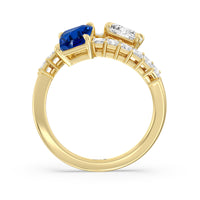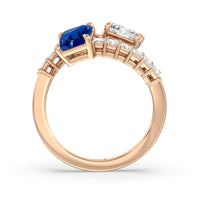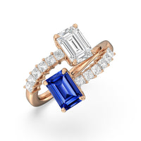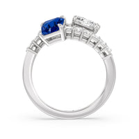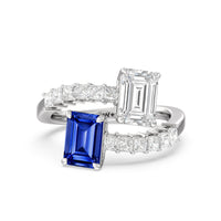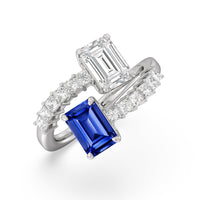 An alternative sparkler for the woman who wants something extremely romantic yet a bit out of the ordinary. This two-stone "toi et moi" engagement ring symbolizes the meeting of two individuals. The band does not form a closed circle and instead splits and coils. Each end is punctuated by an emerald-cut diamond and Created sapphire, accentuated by a short row of princess-cut diamonds.