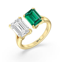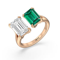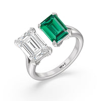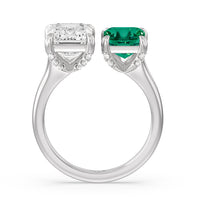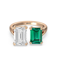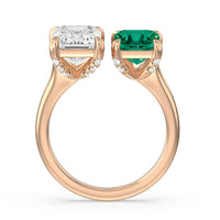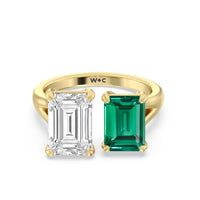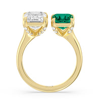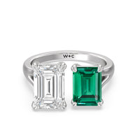 Consider this engagement ring if you're searching for a sentimental classic with a unique shine. This toi et moi engagement ring features a split shank where the two ends don't meet to form a complete circle. One end of the shank holds a bigger emerald-cut diamond while the other end holds a smaller Created Emerald emerald-cut. The two step-cut diamonds are beautifully set on a diamond-traced four-prong basket.