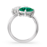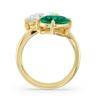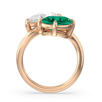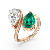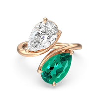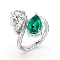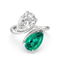 Pick this ring if you're searching for a modern minimalist engagement ring that tells a story and tells it in a simply romantic way. This toi et moi or you-and-me ring perfectly depicts the meeting of two souls. It features a slim yet curvy bypass shank, with each end topped with a pear-cut created Emerald and diamond on a three-prong basket setting.