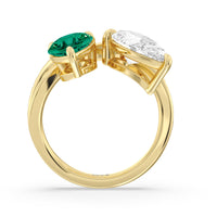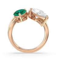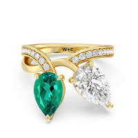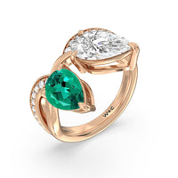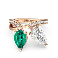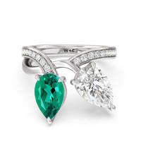 Here is an engagement ring designed with a strong, modern, and edgy look, finished with a romantic story to tell. This unconventional stunner features a vine-like shank characterized by diamond-traced curved shoulders, one of which leads to a brilliant pear-cut stone. A polished ribbon that stems from one of the glittering shoulders holds another pear-cut diamond. The pear stone duo visually showcases the coming together of two individuals as a couple.