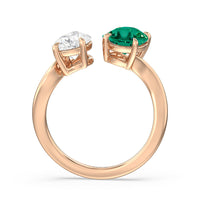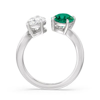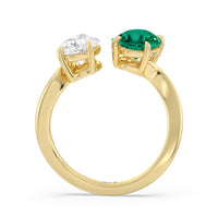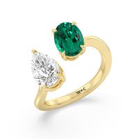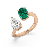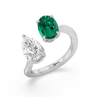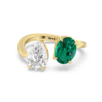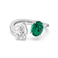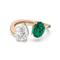 Begin your forever with a dazzling two-stone stunner that elegantly twists and shines. This luxurious engagement ring features a curvaceous band with a pear diamond and an oval created Emerald meeting at the center. Nicknamed "toi et moi" or you-and me, this ring design symbolizes the meeting of two souls and their harmonious union.
