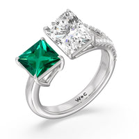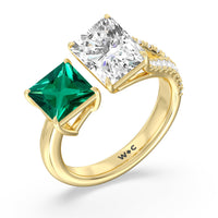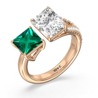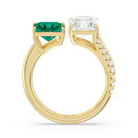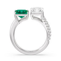 The perfect depiction of when two different individuals meet and recognize instantaneously that they're meant for each other. This romantic two-stone ring features an open band where one end has a smooth shoulder and a Created Emerald princess tip while the other end has a diamond-traced split shoulder with a radiant-cut diamond on its tip. The two main gemstones shine side by side in harmony.
