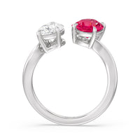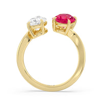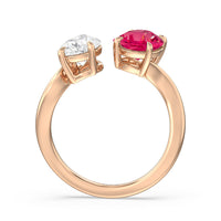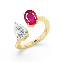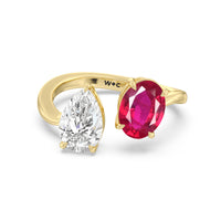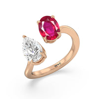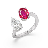 Begin your forever with a dazzling two-stone stunner that elegantly twists and shines. This luxurious engagement ring features a curvaceous band with a pear diamond and an oval created Ruby meeting at the center. Nicknamed "toi et moi" or you-and me, this ring design symbolizes the meeting of two souls and their harmonious union.