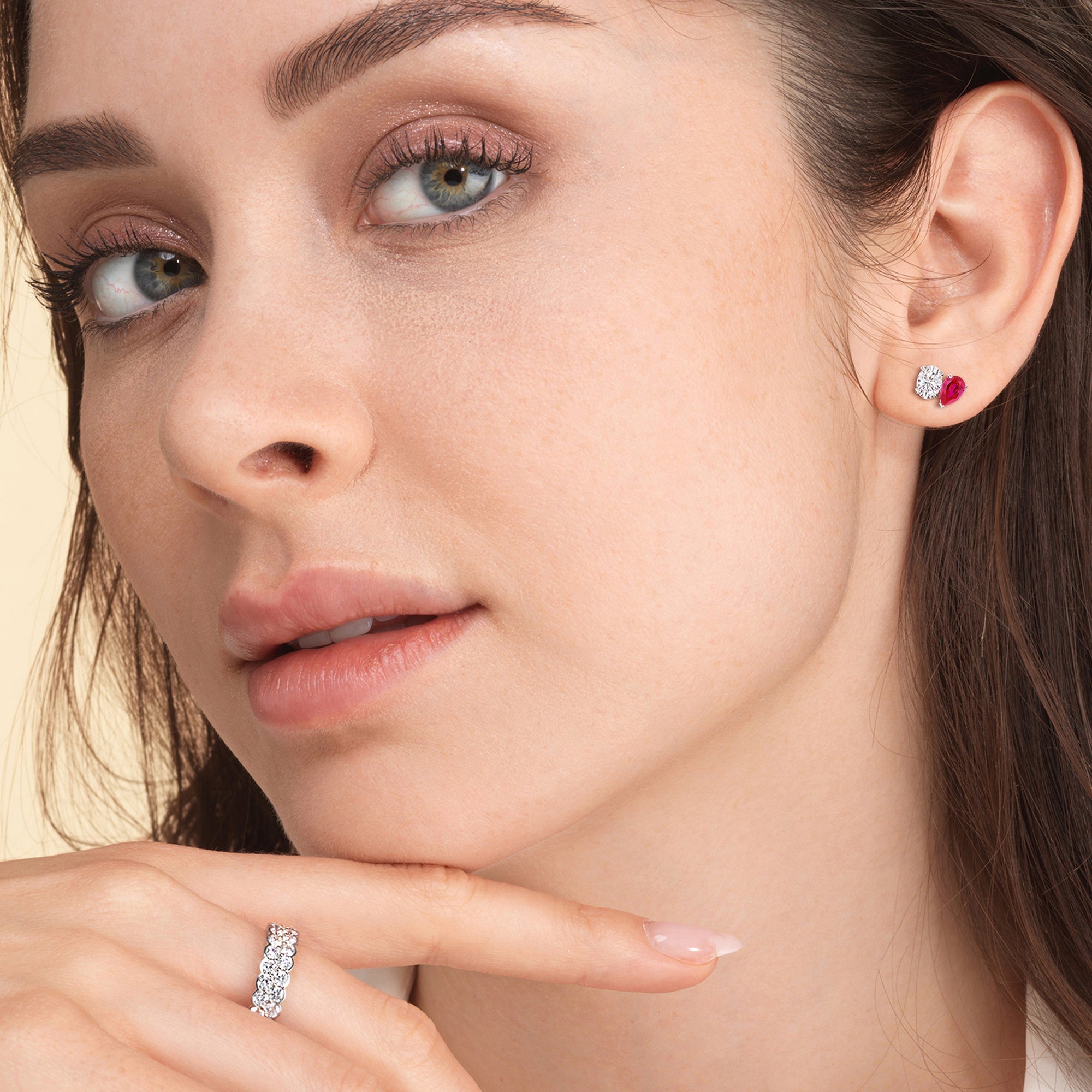 Truly brilliant, these two-stone stud earrings can enhance your style in an instant. They're a good alternative to basic solitaire studs, perfect for when you want to add a bit more glitter and glamour to your looks while still keeping an understated look. The earrings feature an oval diamond and created Ruby pear mounted on an angle, side-by-side, for an edgier style.