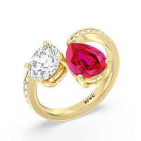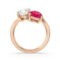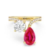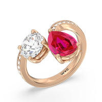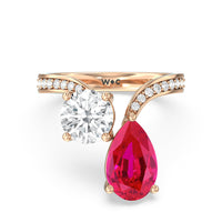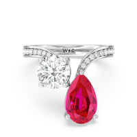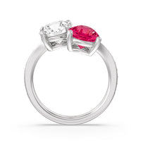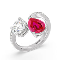 An absolute stunner, this two-stone ring with a beautifully curved band makes an excellent choice to pledge your love and commitment. Its polished shank features diamond-traced shoulders with ends that don't meet. One end slightly curves and holds a 1.75 ct round diamond while the other end curves more dramatically, securing a 2.50 ct pear-cut Created Ruby.