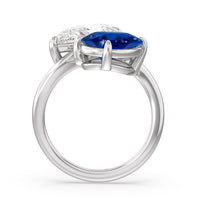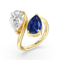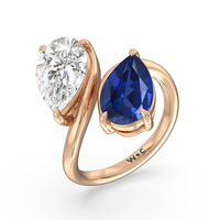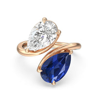 Pick this ring if you're searching for a modern minimalist engagement ring that tells a story and tells it in a simply romantic way. This toi et moi or you-and-me ring perfectly depicts the meeting of two souls. It features a slim yet curvy bypass shank, with each end topped with a pear-cut created sapphire and diamond on a three-prong basket setting.
