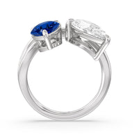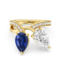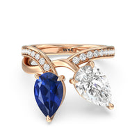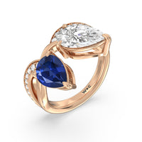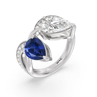 Here is an engagement ring designed with a strong, modern, and edgy look, finished with a romantic story to tell. This unconventional stunner features a vine-like shank characterized by diamond-traced curved shoulders, one of which leads to a brilliant pear-cut stone. A polished ribbon that stems from one of the glittering shoulders holds another pear-cut diamond. The pear stone duo visually showcases the coming together of two individuals as a couple.