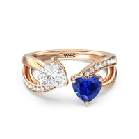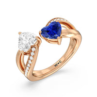 If the idea of an atypical diamond ring excites your beloved, then this artfully designed ring is for her. This unique sparkler features an open split shank punctuated with a duo of heart-shaped diamond and Created sapphire. A short row of round diamonds run along one strip of the band's split shoulders. This ring with an unusual form and silhouette is the perfect choice for someone looking for something timeless yet distinctive.