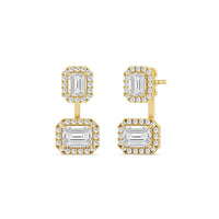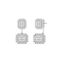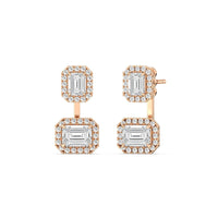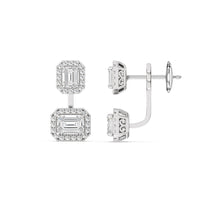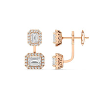 A trendy pair of diamond earrings for the fashionista who likes a little more glitter in her everyday looks. The earrings come with a front-back design featuring a haloed emerald diamond post with a closure that curves forward from behind, showcasing another emerald diamond. Wearing this pair will surely make your inner glamour shine.