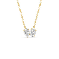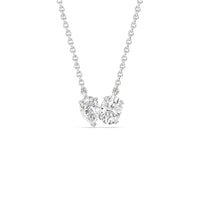 Here is a diamond pendant you can wear on countless occasions. This two-stone beauty features a pear-cut diamond and an oval-cut diamond on individual pronged basket setting. They sit beside each other, with their own bails, radiating their brilliance individually and together.