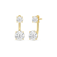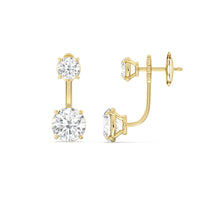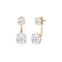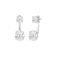 Sparklier than your standard diamond studs, these trendy front-and-back earrings dazzle with twice the amount of glitter. The earrings come with a round diamond stud post fastened by a curving "jacket" clasp that holds a larger round diamond on its tip. These earrings make a subtle statement with their sassy yet smart and sharp style.