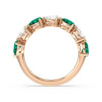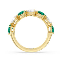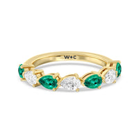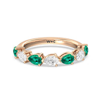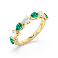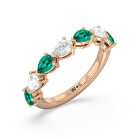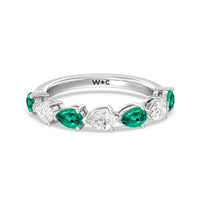 A subtle shift in perspective and you'll instantly see how this modernized classic can effortlessly wow the one you love. This anniversary band features a polished shank, half of which is traced with pear-cut diamonds and created Emerald in an unconventional east-west setting. The horizontal setting of the stones gives a fresh, unexpected, and dramatic twist to the classic look of a traditional half-eternity ring.