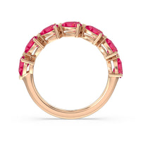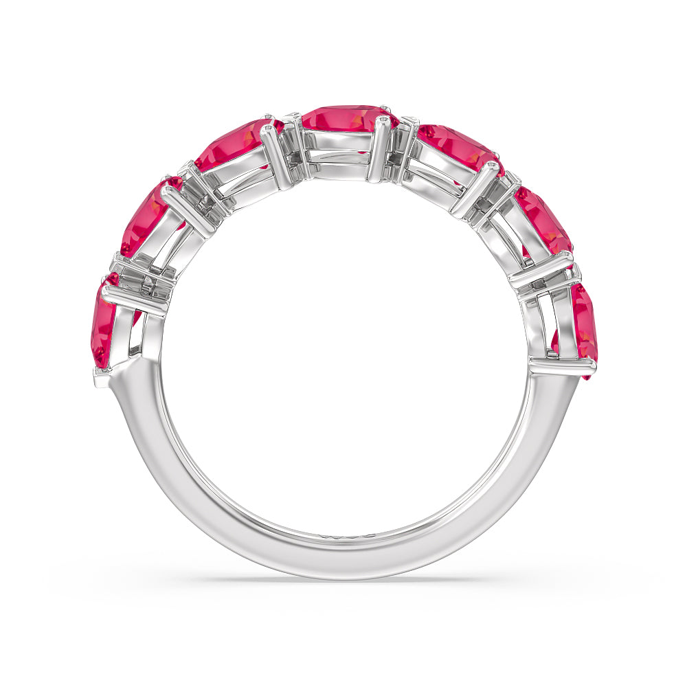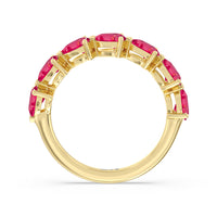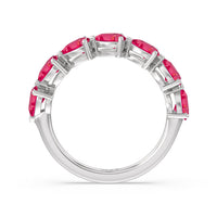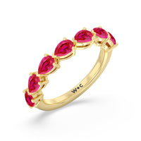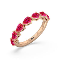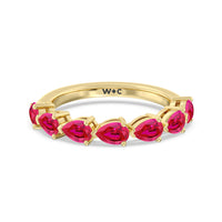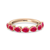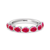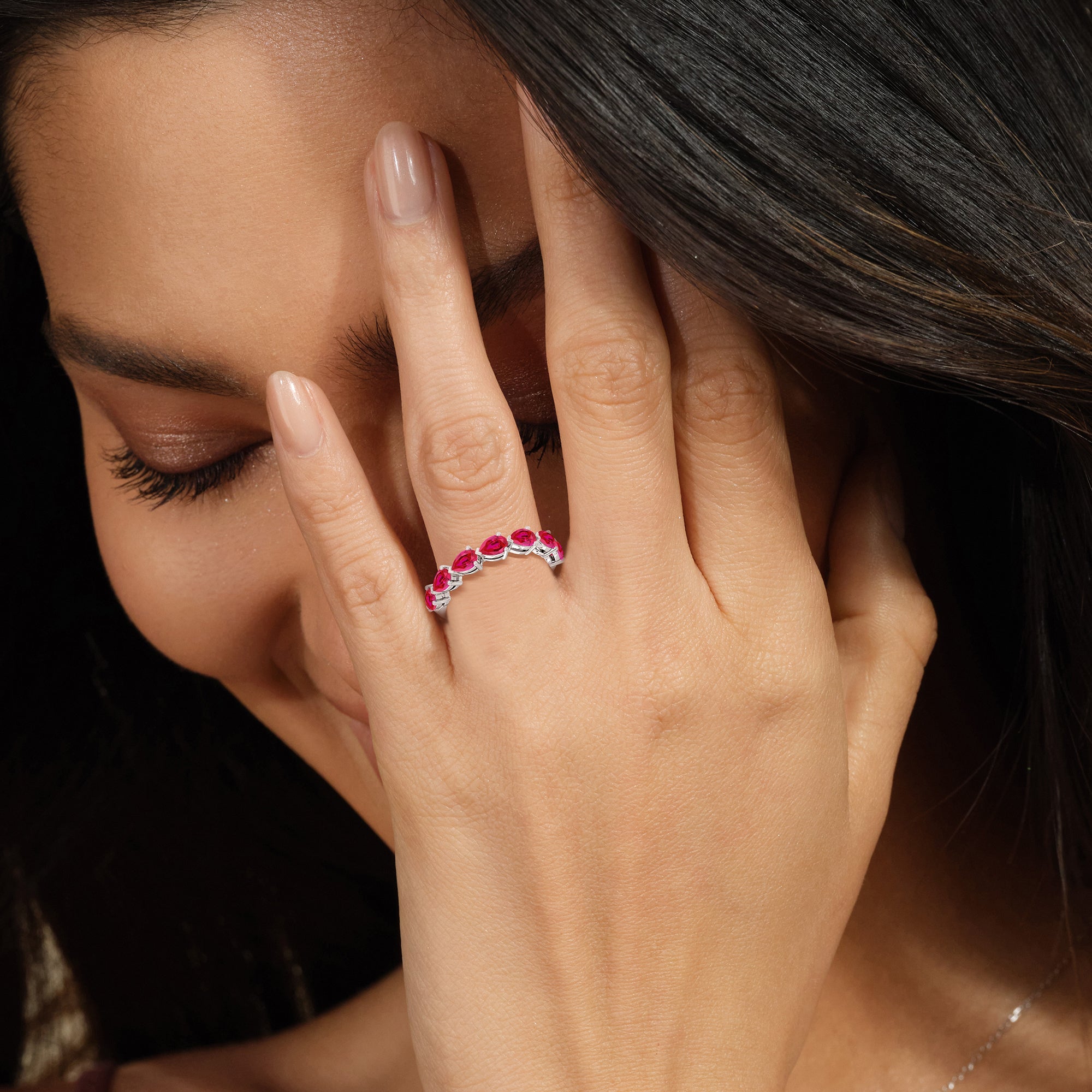 A subtle shift in perspective and you'll instantly see how this modernized classic can effortlessly wow the one you love. This anniversary band features a polished shank, half of which is traced with pear-cut created Ruby in an unconventional east-west setting. The horizontal setting of the stones gives a fresh, unexpected, and dramatic twist to the classic look of a traditional half-eternity ring.
