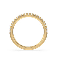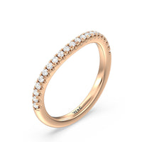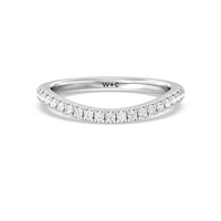 This curved diamond set wedding band is perfectly contoured to complement our trellis side stone solitaire engagement ring for a simple and sophisticated look.