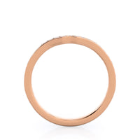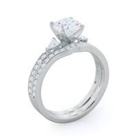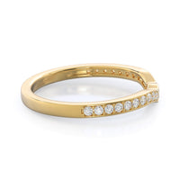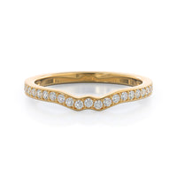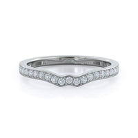 Worn alone, this pave wedding band captures the shape of ripples on a pond. its a romantic, feminine design, but it also serves a purpose. Those gentle waves allow your matching wedding band to lock into place next to your engagement ring, draping diamond around every curve.