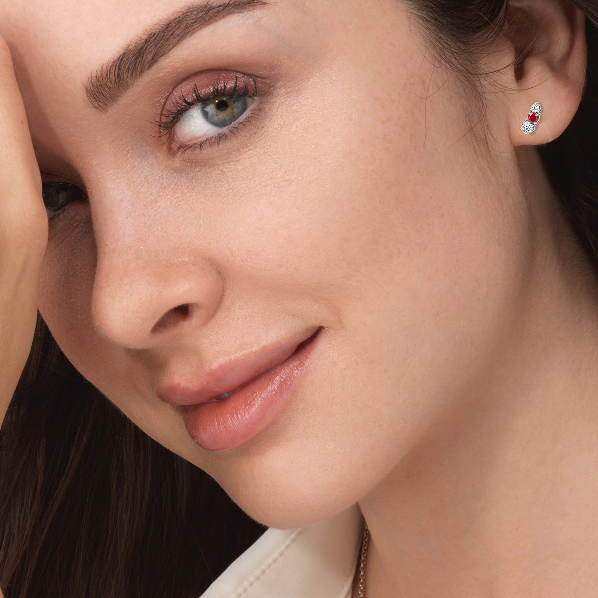 These three-stone ear climbers are versatile and extremely easy to wear. Each earring features a trio of round diamonds and created ruby in graduating sizes, set in a semi-straight line. You only need this pair to get that fashion-forward multiple-piercing look without having to actually get extra holes.