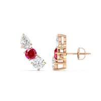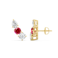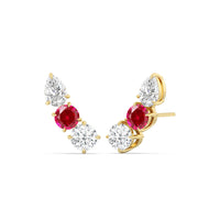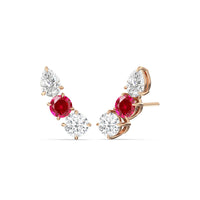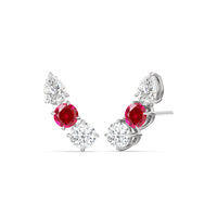 Make a sparkling style statement with these versatile earrings. These ear climbers feature a trio of diamonds and created ruby - two round cuts and one pear cut - laid out to look like they're "climbing" the curve of the ear. Wear it as a pair, or singly on a second hole to complement other earrings.