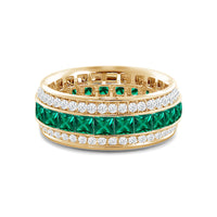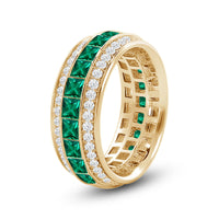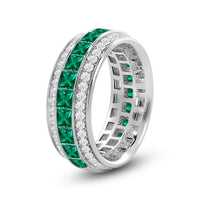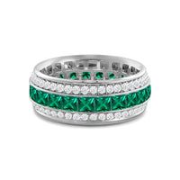 For a loved one who's anything but ordinary. Here is a stunning eternity band that makes an unexpected style statement. The shank is covered with three rows of diamonds, two of which feature round diamonds. Sandwiched in the middle is a circle of channel-set Created Emerald princess-cut. This band would, undeniably, make a precious promise ring or anniversary ring.