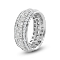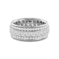 For a loved one who's anything but ordinary. Here is a stunning eternity band that makes an unexpected style statement. The shank is covered with three rows of diamonds, two of which feature round diamonds. Sandwiched in the middle is a circle of channel-set princess-cut diamonds. This band would, undeniably, make a precious promise ring or anniversary ring.