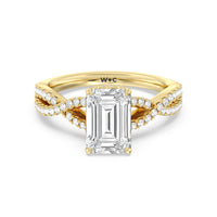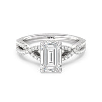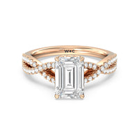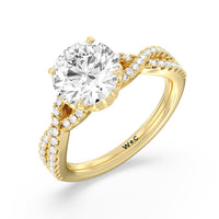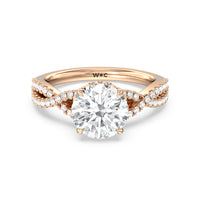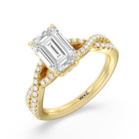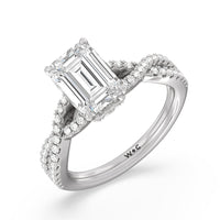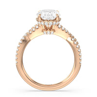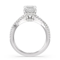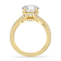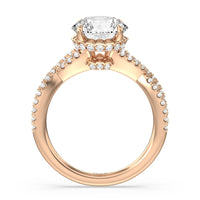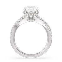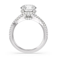 How could one not fall in love with this ring? This exquisite piece features a twisted split shank with round diamonds gliding over its curved shoulders. Taking centerstage is a gorgeous diamond with not just one hidden halo. Right below the center stone is a circle of diamonds embracing the prominent four-prong basket setting. At the base of the basket and forming part of the bridge is a hidden halo extension for that extra sweet touch of glitter.