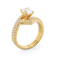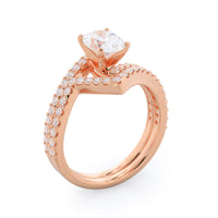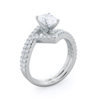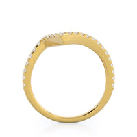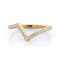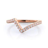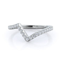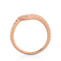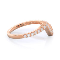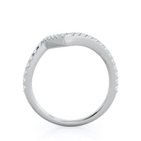 This pave wedding band might resemble a lightning bolt, but the shape is carefully crafted to sit snugly in line with our Twist Diamond Engagement Ring. We also covered the top and sides of this matching wedding band in accent stones to match your diamond ring and ensure that the two together sparkle from absolutely every angle.