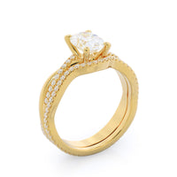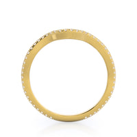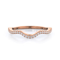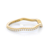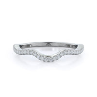 A graceful curved top ensures that this pave wedding band conforms to your Twisting Vine Diamond Ring, hugging it close and making it clear they're a wedding ring stack meant to be worn as a pair. The additional diamonds on the band actually enhance the effect of the plain metal part of your engagement ring, making it pop to people admiring it.