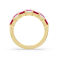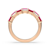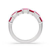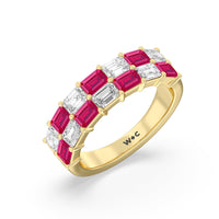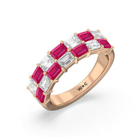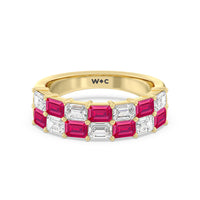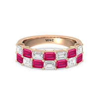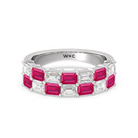 For someone who leans toward the dramatic, here is a stunner that guarantees a substantial presence on the finger. The ring features double rows of emerald-cut stones in horizontal or east-west setting. The elongated shape of the step-cut diamonds and created Ruby delivers an innately glamorous yet refined brilliance with just the perfect vintage touch.
