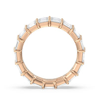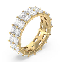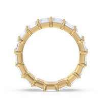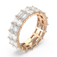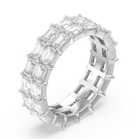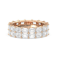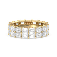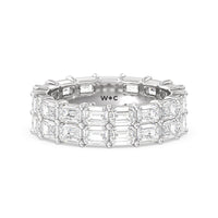 A sophisticated choice for a diamond eternity ring. This glittering piece features two continuous rows of emerald-cut diamonds set on shared prongs on a polished band. The rectangular and long facets of the step-cut gems are elegant and flattering on the finger. The rich beauty of this eternity ring will impress someone who appreciates old-world glamour.