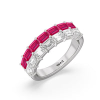 For someone who leans toward the dramatic, here is a stunner that guarantees a substantial presence on the finger. The ring features double rows of emerald-cut stones in horizontal or east-west setting. The elongated shape of the step-cut diamonds and created Ruby delivers an innately glamorous yet refined brilliance with just the perfect vintage touch.