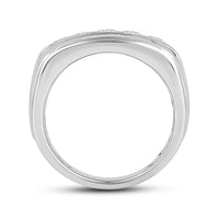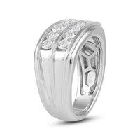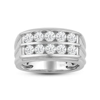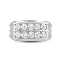 This ring boasts a suave mix of clean lines and bold brilliance. The band has a wide, square-edged top adorned with three raised yellow-gold stripes, with a shimmering channel of five round diamonds in between. A bright polished finish rounds out the masculine elegance of this piece.