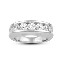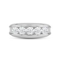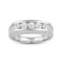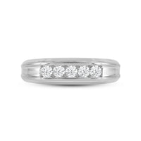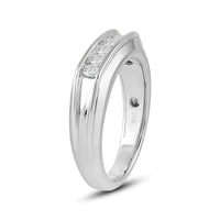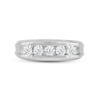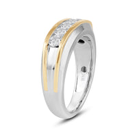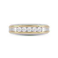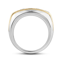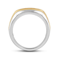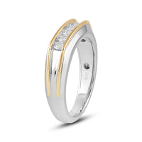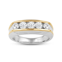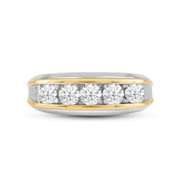 A sparkler to fit a man's world. This two-toned ring shines with modern architectural elegance. It features a 14K white gold band with a rounded rectangular top that tapers toward the back. The centerpiece is a row of five round diamonds on a channel setting sandwiched between two angular strips of yellow gold. This contemporary ring would suit a fashion-forward groom and would also make an excellent special occasion or "just because" gift for the stylish man in your life.