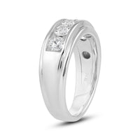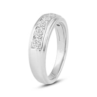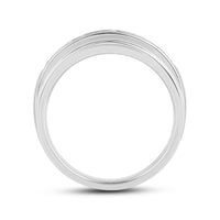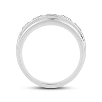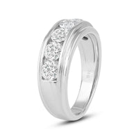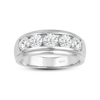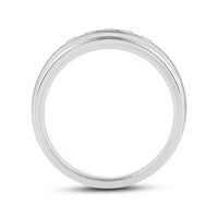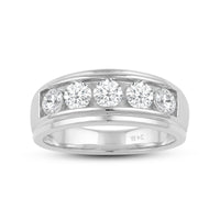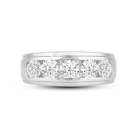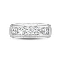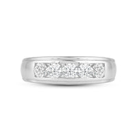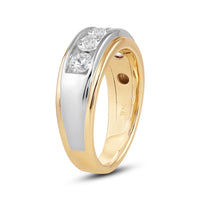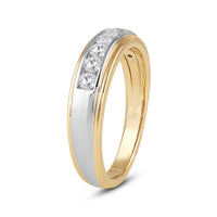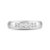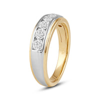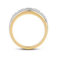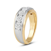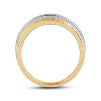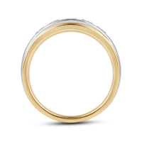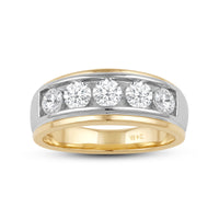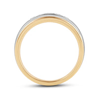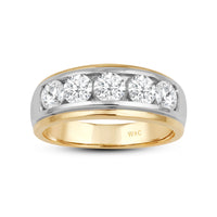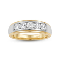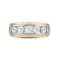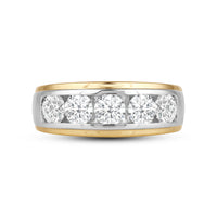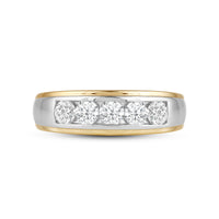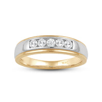 Great as a special occasion gift or as a wedding band, this two-toned ring features an unassuming and versatile profile. Five round diamonds on a channel setting are nestled within a subtly raised white gold ribbon across the front face of a 14K yellow gold band. The polished finish of this ring completes its refined look.