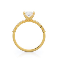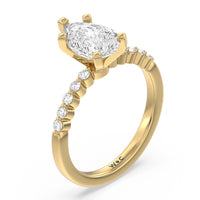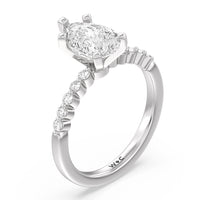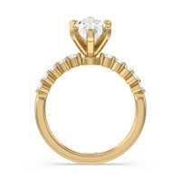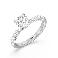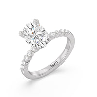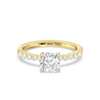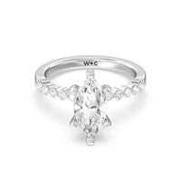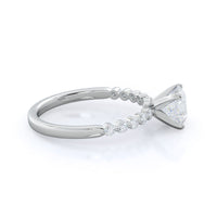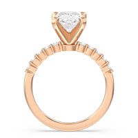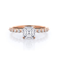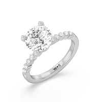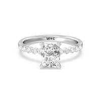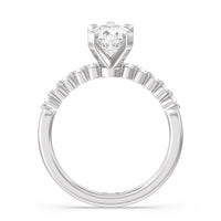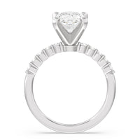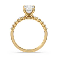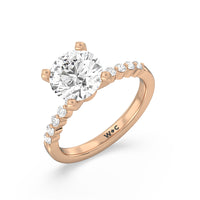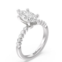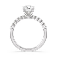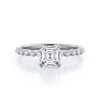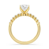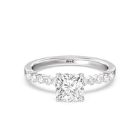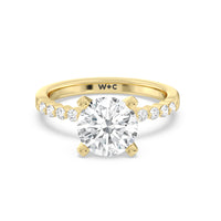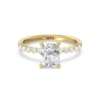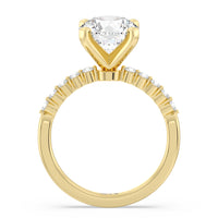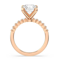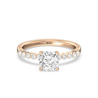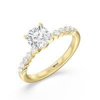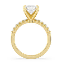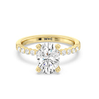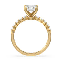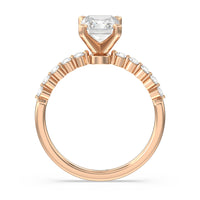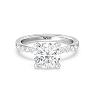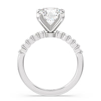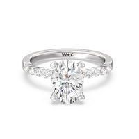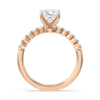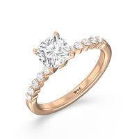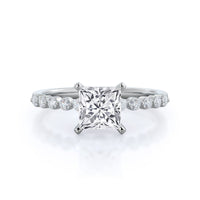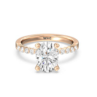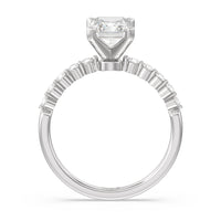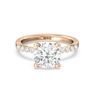Under bezel shared prong accent diamonds float on the side of your center stone