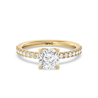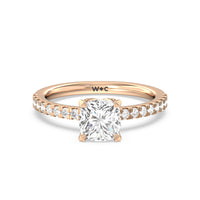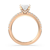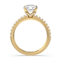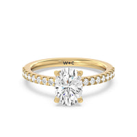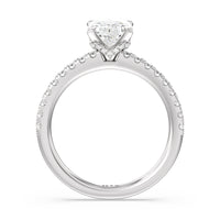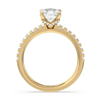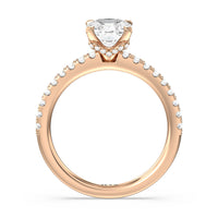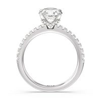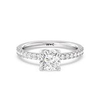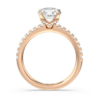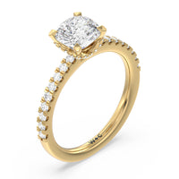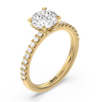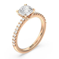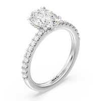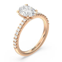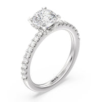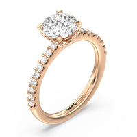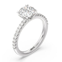 This sophisticated engagement ring features our signature arc hidden halo design along with a diamond pave band to highlight the centre stone perfectly! A modern take on a classic style.