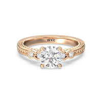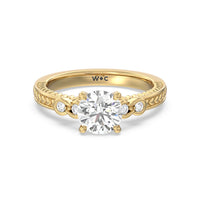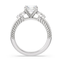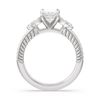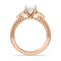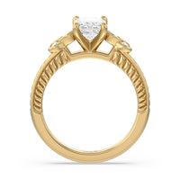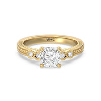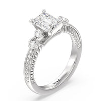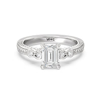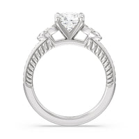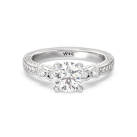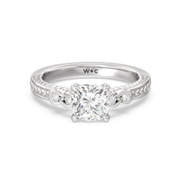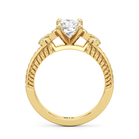 The dazzling center stone of this Celtic-style engagement ring is held by a classic four-prong setting on a beautifully detailed shank. The Celtic knot design features on the shoulders of the ring and is complemented by a row of small heart shapes on each side, as well as soft waves engraved on the front view.
