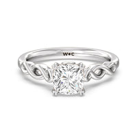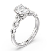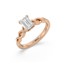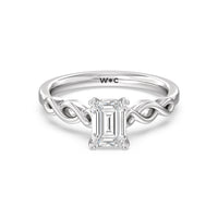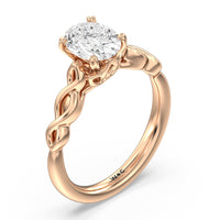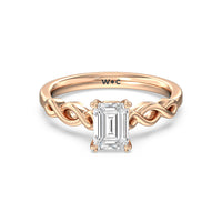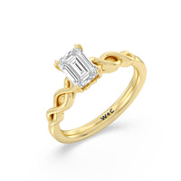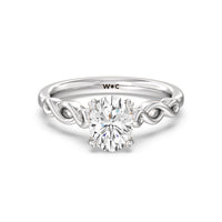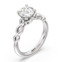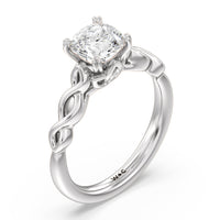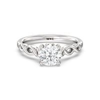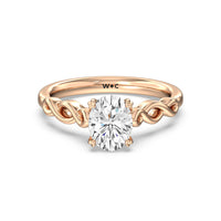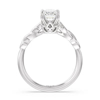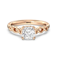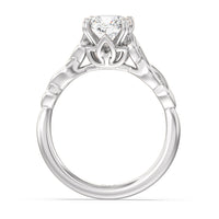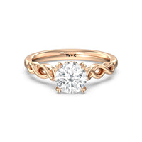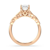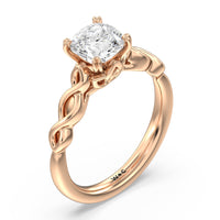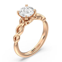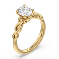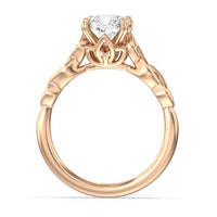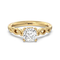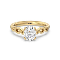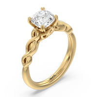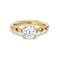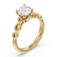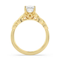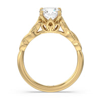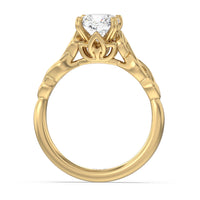 A highly symbolic style featuring clover-flower motifs in the gallery and Celtic twists along the shoulders, representing pure love and everlasting luck. The dazzling center stone is held with four claw prongs. Set in gold.